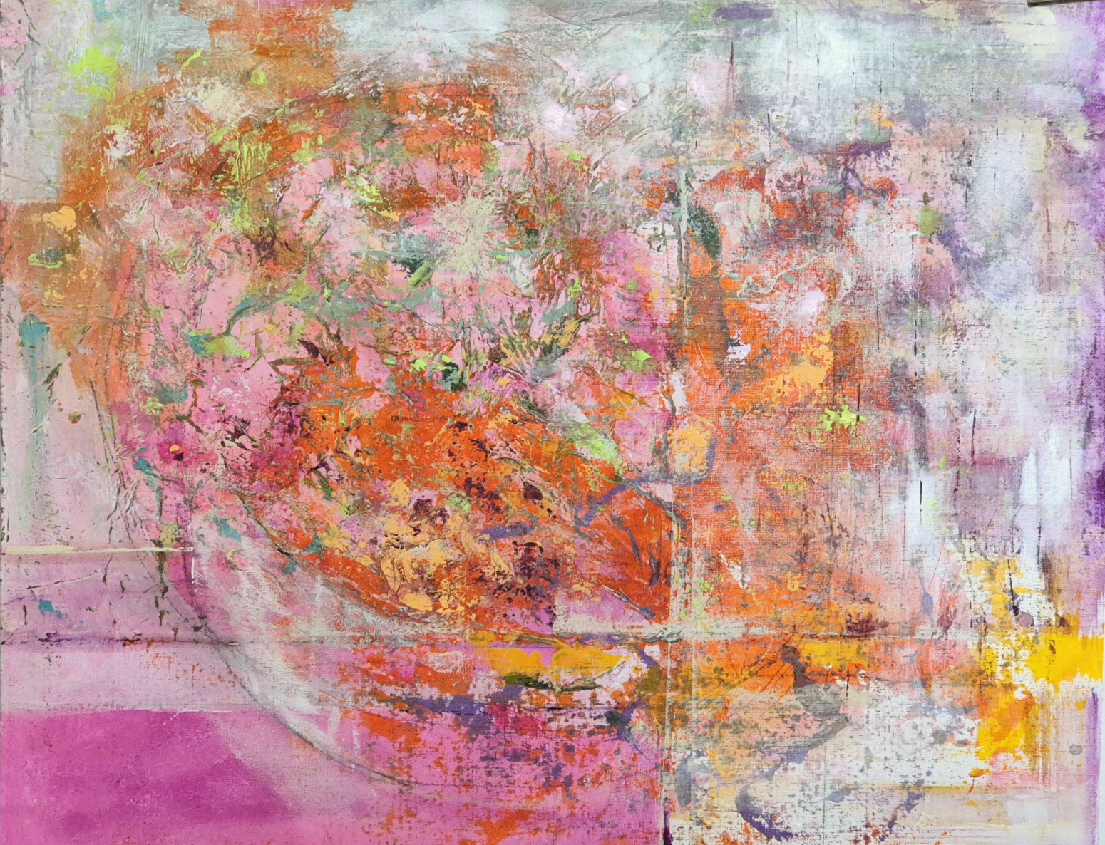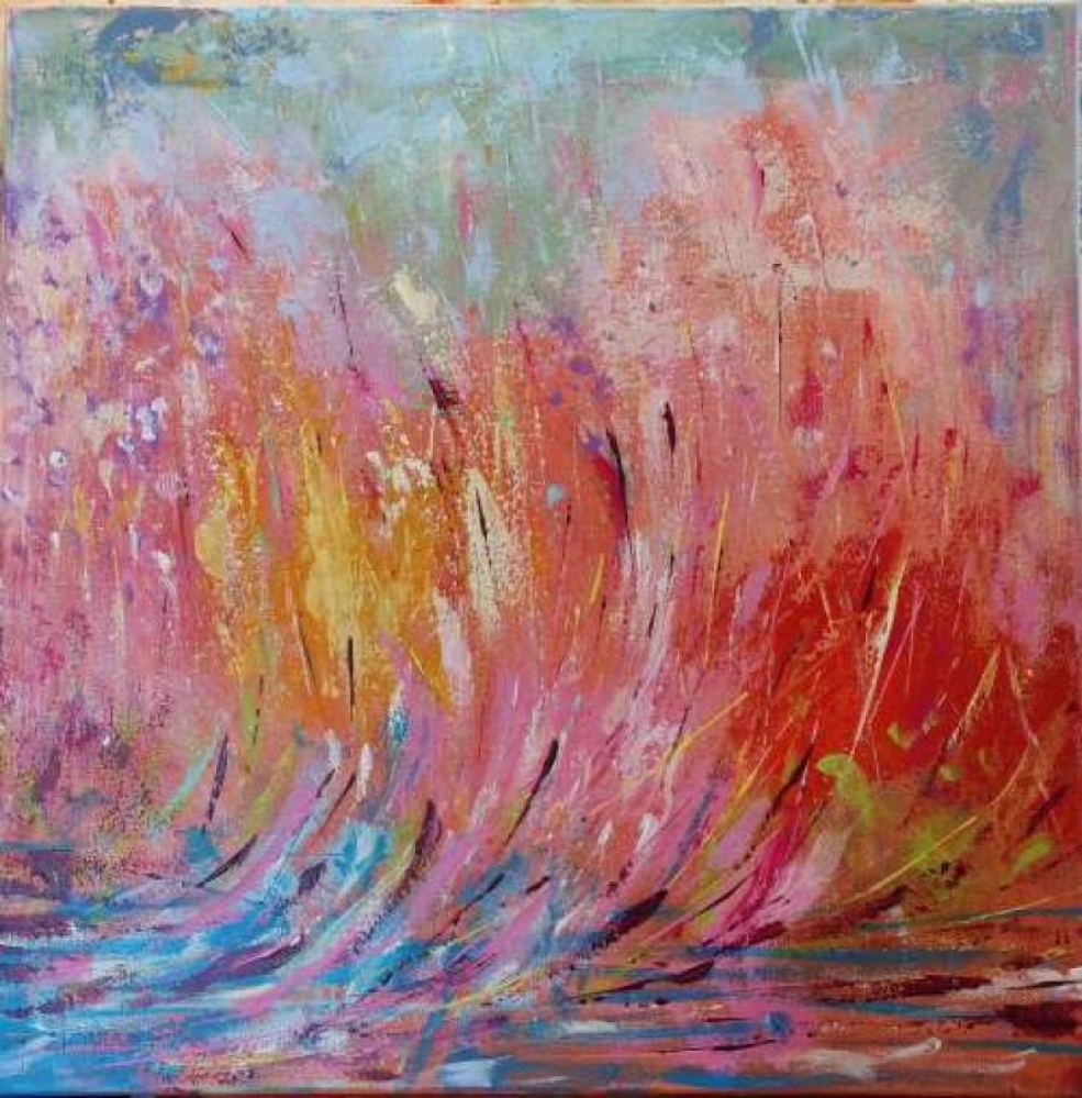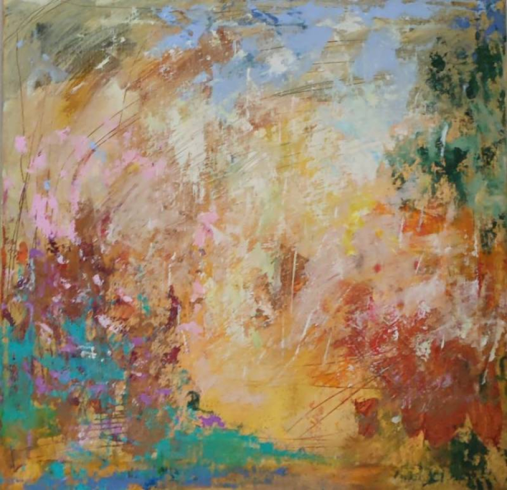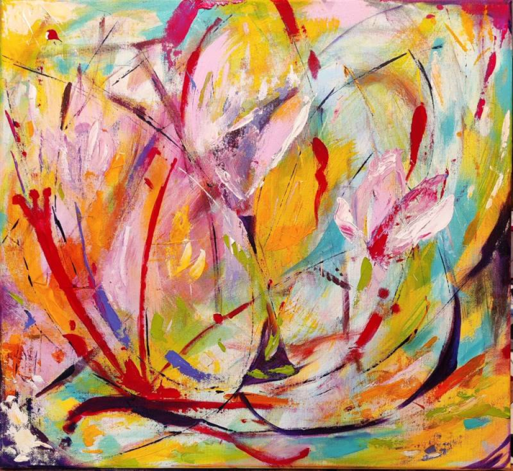 Akryyli kankaalle 55x60 cm, Kuvaan tässä teoksessa vauhdikkaasti villin tuulen pyörittämää värikkäänä hehkuvaa kukkapuutarhaa.